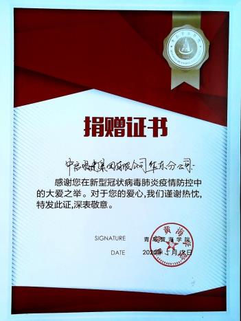 黃海學院基建中心李傳江主任及后勤保障部、疫情防控工作領導小組辦公室相關領導接受捐贈,對我公司的捐贈表示感謝,并為公司頒發捐贈證書。