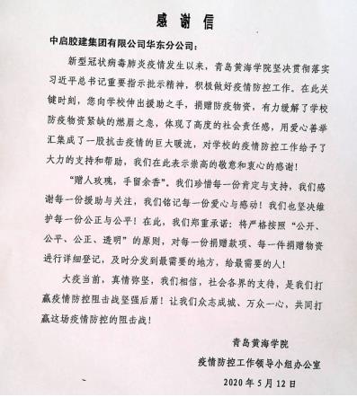 目前,全國疫情得到有效控制,各項生產生活正在積極推進,我市各學校教育系統也按照規定陸續開學。為全面做好學校常態化疫情防控工作,助力學校開學,5月12日,中啟膠建集團有限公司華東分公司向青島黃海學院捐贈醫用口罩10500個,84消毒液5桶、醫用酒精5桶等一批防疫物資,全力協助黃海學院做好開學前的準備工作。