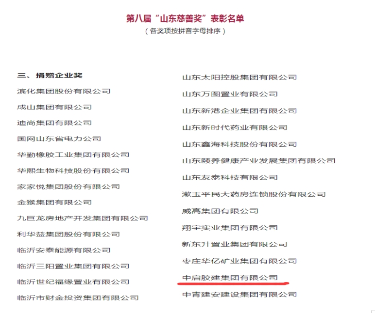 近日,山東省民政廳印發《關于表彰第八屆“山東慈善獎”獲得者的決定》,對2020年10月至2022年12月期間在山東省慈善領域作出突出貢獻的先進典型予以表彰,授予100個愛心個人、愛心團隊、捐贈企業、慈善項目第八屆“山東慈善獎”。其中,慈善楷模10個、捐贈個人13個、捐贈企業51個、慈善項目26個。中啟膠建集團有限公司榮獲第八屆“山東慈善獎”愛心捐贈企業。“山東慈善獎”是山東省慈善領域政府最高獎。