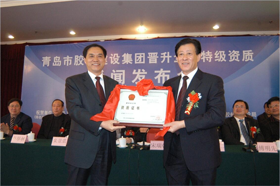 山東省建筑工程管理局局長宋瑞乾在公司房屋建筑工程施工總承包特級資質新聞發布會上向中啟膠建集團頒發特級資質證書