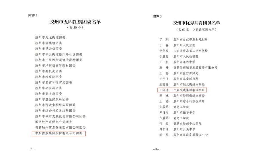 近日,膠州團市委在市會議中心四樓多功能廳舉行“學習二十大、永遠跟黨走、奮進新征程”膠州市紀念五四運動104周年主題團日活動,市委副書記劉濤出席并發(fā)表致辭,團市委書記劉毅帶領全體團員團干部重溫入團誓詞,會上對全市“五四典型”進行通報表揚。中啟控股集團股份有限公司團委榮獲2022年度“膠州市五四紅旗團委”稱號,中啟膠建集團膠州公司團員青年職工王銘濤榮獲“膠州市優(yōu)秀共青團員”稱號。