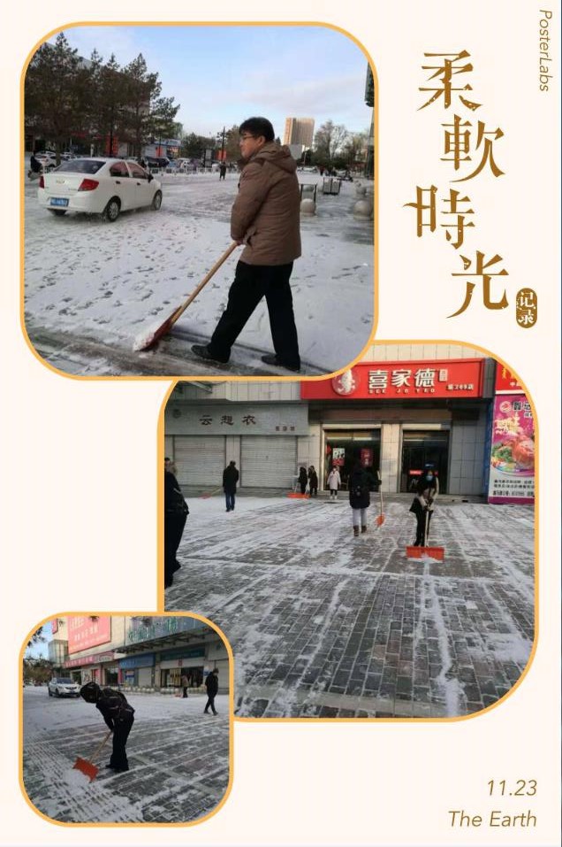 通遼近日迎來了一場像模像樣的雪,咱們中啟廣場也被積雪覆蓋,銀裝素裹分外妖嬈。為了不使積雪給廣大消費者以及員工帶來諸多不便,我們財務部、物業等部門都組織起來,早早的來到各自分擔區內開始備戰了。