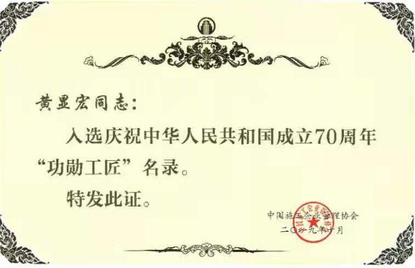 2019年11月16日下午,由中國施工企業管理協會主辦的工程建設行業慶祝中華人民共和國成立70周年宣傳展示總結大會在北京舉行。大會對中華人民共和國成立70周年以來工程建設行業取得卓越成績的百家功勛企業、百項經典工程和百名功勛工匠進行了宣傳表彰。中啟膠建集團榮獲“功勛企業”榮譽稱號,公司員工賈維敏、黃顯宏榮獲“功勛工匠”榮譽稱號。