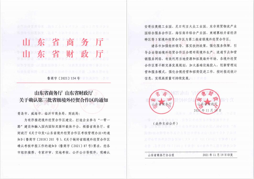 2021年11月19日,根據《山東省商務廳、山東省財政廳關于確認第三批省級境外經貿合作區的通知》(魯商字﹝2021﹞154號),柬埔寨桔井省經濟特區確認為第三批省級境外經貿合作區。