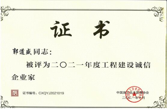 近日,中國施工管理協會發布了《關于公布2021年度工程建設誠信企業家評價結果的通知》,中啟膠建集團總經理郭道盛獲評“2021年度全國工程建設誠信企業家”。