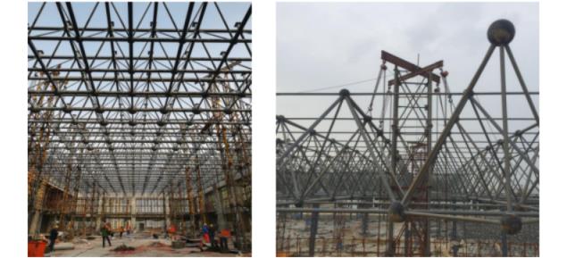 大跨度焊接球網(wǎng)架樓面整體拼裝,拔桿提升施工