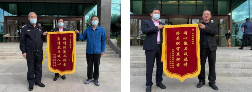 在各級領導的大力支持下、各位同事的共同協作下,經過半個多月的閉環管理,中啟康年酒店以零失誤的成績圓滿的完成了此次接待任務,受到了管控部與突擊隊的高度贊揚。11月18日下午,酒店樓和公寓樓兩邊突擊隊(分別是膠州市市場監督管理局、膠州市綜合行政執法局)分別授予了中啟康年酒店錦旗,以此表彰中啟康年酒店在此次接待工作中所做出的突出貢獻。這是續今年年初接待隔離留觀人員以來,喜獲的第五、第六面錦旗。
