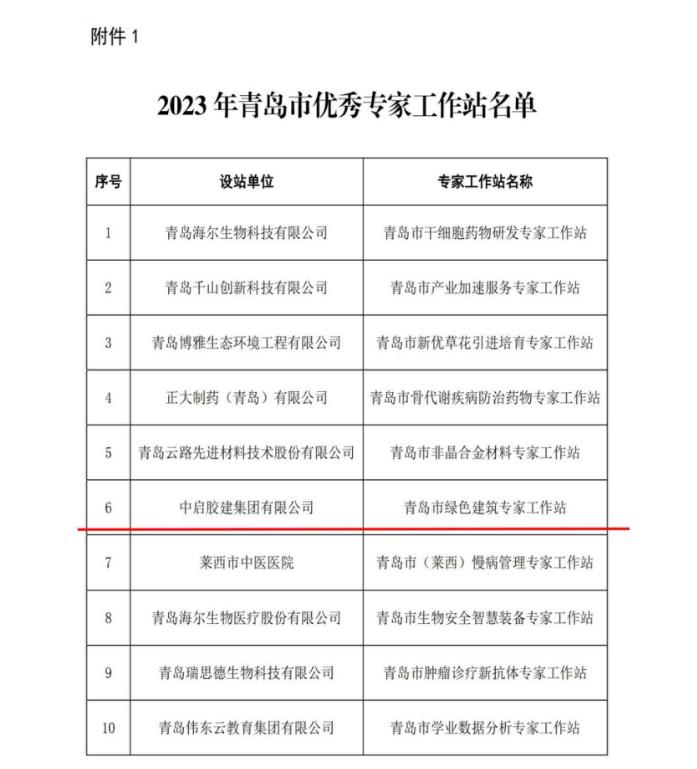 日前,在青島市人力資源和社會保障局組織的2023年青島市優(yōu)秀專家工作站評選中,中啟膠建集團(tuán)有限公司的“綠色建筑專家工作站”,被評為2023年青島市優(yōu)秀專家工作站。
