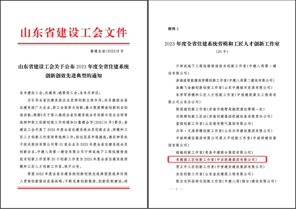 近日,山東省建設工會委員會公布了20個山東省住建系統工匠人才創新工作室。其中,中啟膠建集團有限公司“宋德強工匠創新工作室”被評為“2023年度山東省住建系統工匠人才創新工作室”。