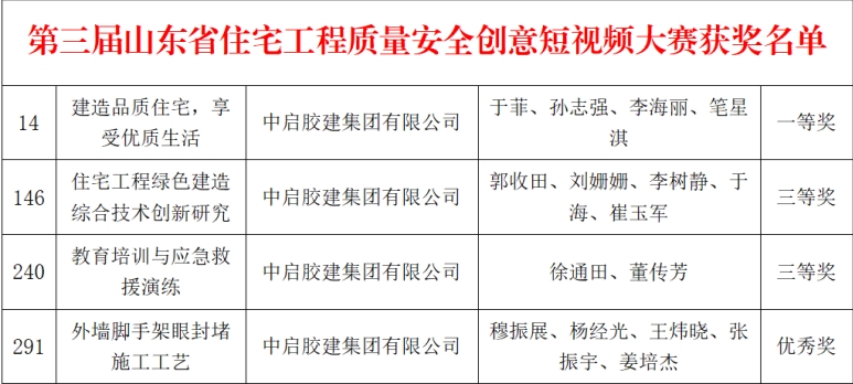 經各市初評、省大賽專家組終審和省專家評審委員會復核,最終我公司有4項作品取得了佳績。其中,項目管理公司的作品《建造品質住宅,享受優質生活》榮獲一等獎,膠州公司的作品《住宅工程綠色建造綜合技術創新研究》和建筑七公司的作品《教育培訓與應急救援演練》榮獲三等獎,青島公司的作品《外墻腳手架眼封堵施工工藝》榮獲優秀獎。