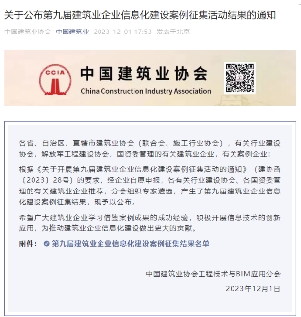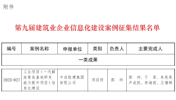 12月1日,中國(guó)建筑業(yè)協(xié)會(huì)公布了第九屆建筑業(yè)企業(yè)信息化建設(shè)案例征集活動(dòng)結(jié)果,中啟膠建集團(tuán)承建的一汽解放青島基地研發(fā)能力提升項(xiàng)目榮獲“一類成果”佳績(jī)。