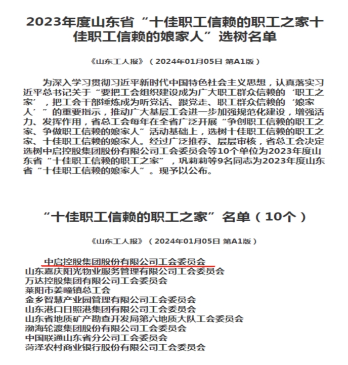 近日,山東省總工會在全省范圍內(nèi)開展“爭創(chuàng)職工信賴的職工之家、爭做職工信賴的娘家人”選樹活動。經(jīng)過廣泛推薦、網(wǎng)絡(luò)投票、現(xiàn)場考察等層層審核,全省共選樹10個單位為2023年度山東省“十佳職工信賴的職工之家”,中啟控股集團(tuán)股份有限公司工會委員會成功獲評此項(xiàng)榮譽(yù)。