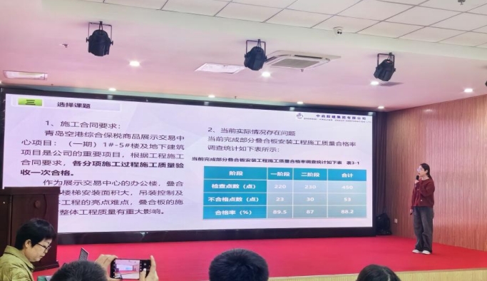 經(jīng)過5個多小時的激烈角逐,建筑七公司發(fā)布的《研發(fā)80米跨弦支穹頂漸擴頂升同步預(yù)應(yīng)力張拉施工方法》、《提高現(xiàn)澆連續(xù)跨預(yù)應(yīng)力環(huán)梁施工一次合格率》和建設(shè)項目管理公司發(fā)布的《提高大跨度預(yù)拼裝鋼桁架整體提升一次驗收合格率》3項QC小組成果脫穎而出,以程序符合要求、成果實施效果良好受到了評委們的一致肯定和好評,位列前三。