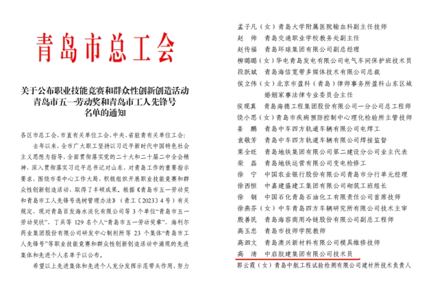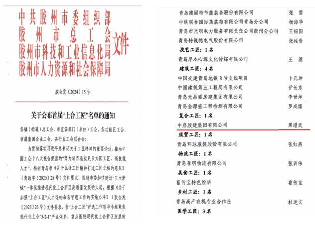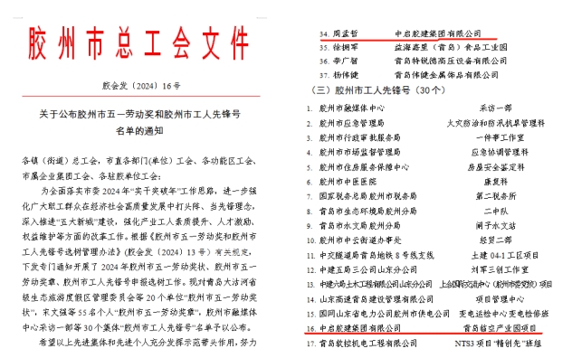 值此“五一”國際勞動(dòng)節(jié)來臨之際,4月29日上午,膠州市慶祝“五一”國際勞動(dòng)節(jié)大會(huì)暨膠州市總工會(huì)第十三屆委員會(huì)第二次全體會(huì)議在市會(huì)議中心四樓多功能廳召開。會(huì)上表彰了2024年膠州市獲得各級(jí)榮譽(yù)的先進(jìn)集體和個(gè)人。集團(tuán)斬獲多項(xiàng)殊榮,集團(tuán)黑增武同志榮獲“首屆上合工匠”榮譽(yù)稱號(hào),高清同志榮獲“青島工匠”和“青島市五一勞動(dòng)獎(jiǎng)?wù)隆睒s譽(yù)稱號(hào),周孟哲同志榮獲“膠州市五一勞動(dòng)獎(jiǎng)?wù)隆睒s譽(yù)稱號(hào),青島臨空產(chǎn)業(yè)園項(xiàng)目班組榮獲“膠州市工人先鋒號(hào)”稱號(hào)。
