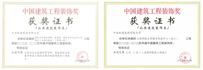 大會發(fā)布了2023年度中國建筑裝飾協(xié)會行業(yè)綜合數(shù)據(jù)統(tǒng)計報告,并頒發(fā)了2023-2024年度第一批中國建筑工程裝飾獎。中啟膠建集團建筑七公司承建的康復(fù)大學(xué)項目學(xué)部、體育館、國際學(xué)術(shù)交流中心等部分(工程總承包)(學(xué)部工程);建筑九公司承建的山東科技大學(xué)圖書信息中心(施工)兩個項目入選。