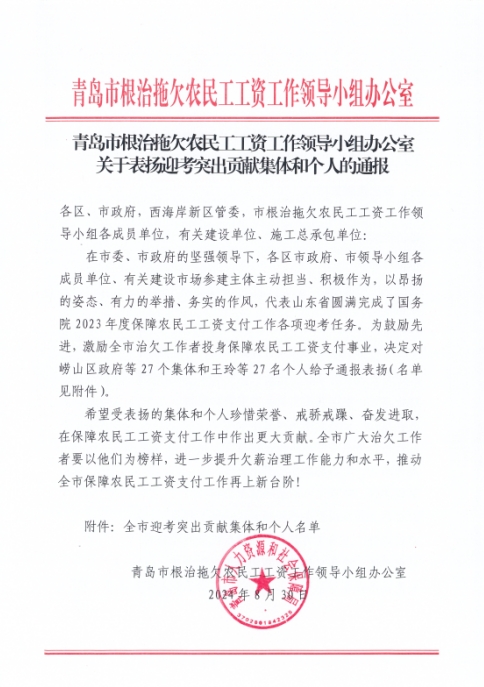 2024年,在公司領導的正確帶領下,在各單位各項目的大力支持和相關工作人員辛勤付出下,公司在保障農民工工資支付工作方面先后圓滿完成了各項調研、檢查工作并取得了優異成績。為表彰我公司在保障農民工工資支付工作方面做出的突出貢獻,青島市人社局、膠州市人社局分別向公司發來感謝信,對公司及在調研、檢查工作中做出突出貢獻的先進項目和先進個人魏翠英、楊國鋒進行通報表揚。