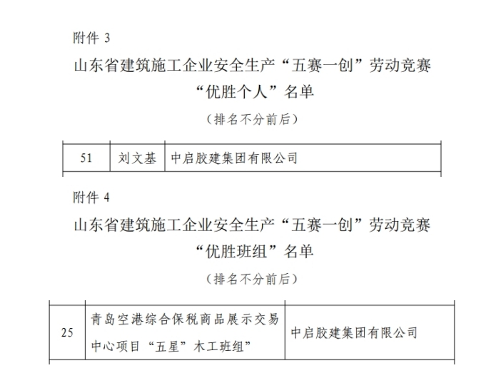 近日,2024年山東省建筑施工企業(yè)安全生產(chǎn)“五賽一創(chuàng)”勞動(dòng)競(jìng)賽活動(dòng)圓滿落幕。其中,中啟膠建集團(tuán)有限公司被評(píng)選為山東省建筑施工企業(yè)安全生產(chǎn)“五賽一創(chuàng)”勞動(dòng)競(jìng)賽“優(yōu)勝單位”,公司承建的青島空港綜合保稅商品展示交易中心項(xiàng)目被評(píng)為“優(yōu)勝班組”,膠州公司劉文基被評(píng)選為“優(yōu)勝個(gè)人”。