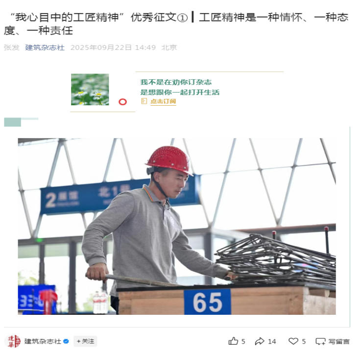 近日,《建筑雜志社》開展了“我心目中的工匠精神”征文活動,中啟膠建集團膠州公司張發(fā)同志的《工匠精神是一種情懷、一種態(tài)度、一種責任》作為優(yōu)秀征文在《建筑雜志社》上刊發(fā),并在山東省住房和城鄉(xiāng)建設廳、山東省建設建材工會等公眾號上轉載宣傳。